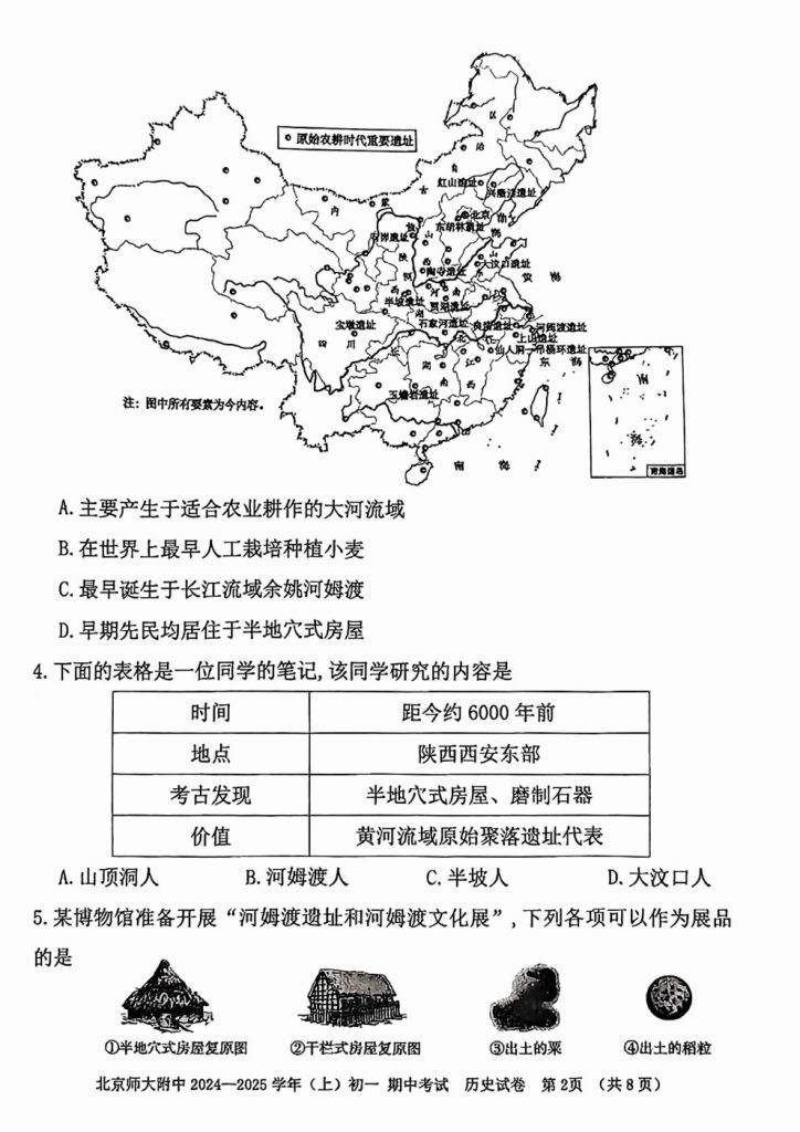 2024北京北师大附中初一(上)期中历史试题