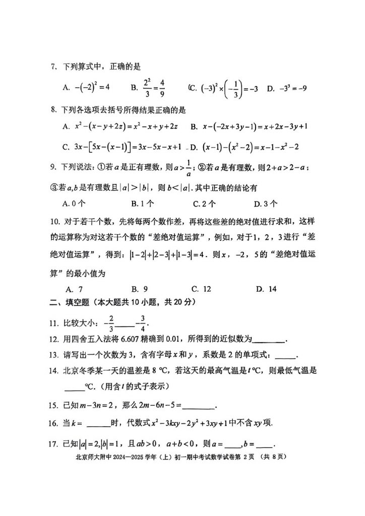 北京2024-2025学年期中考试正在陆续进行中,为方便大家对答案、下载练习等小编给大家搜集了2024北京北师大附中初一(上)期中数学试题,需要的小伙伴赶紧下载练习起来吧: