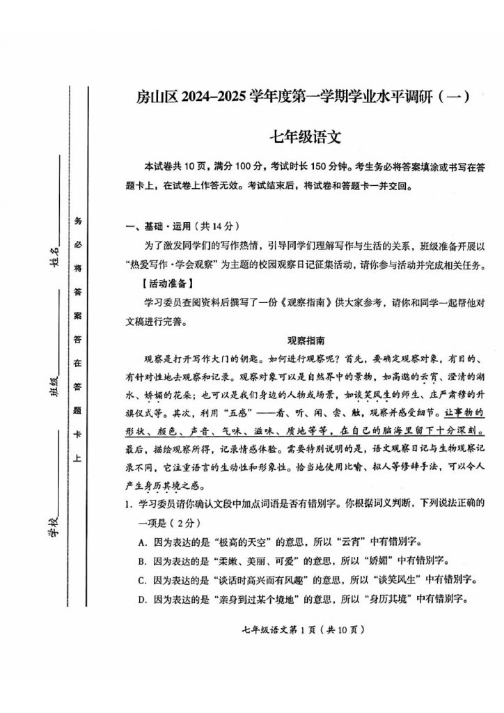 北京2024-2025学年期中考试正在陆续进行中,为方便大家对答案、下载练习等小编给大家搜集了2024北京房山初一(上)期中语文试题,需要的小伙伴赶紧下载练习起来吧: