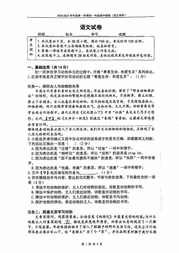 北京2024-2025学年期中考试正在陆续进行中,为方便大家对答案、下载练习等小编给大家搜集了2024北京四中初一(上)期中语文试题,需要的小伙伴赶紧下载练习起来吧: