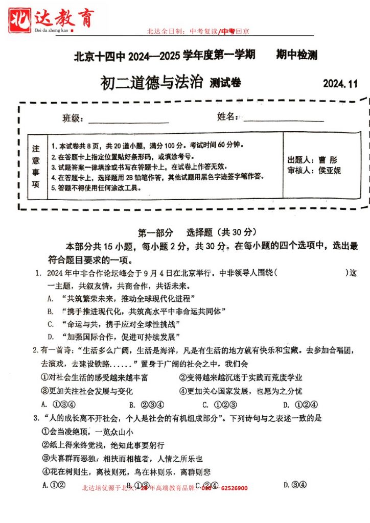 北京2024-2025学年期中考试正在陆续进行中,为方便大家对答案、下载练习等小编给大家搜集了2024北京十四中初二(上)期中道法试题及答案,需要的小伙伴赶紧下载练习起来吧: