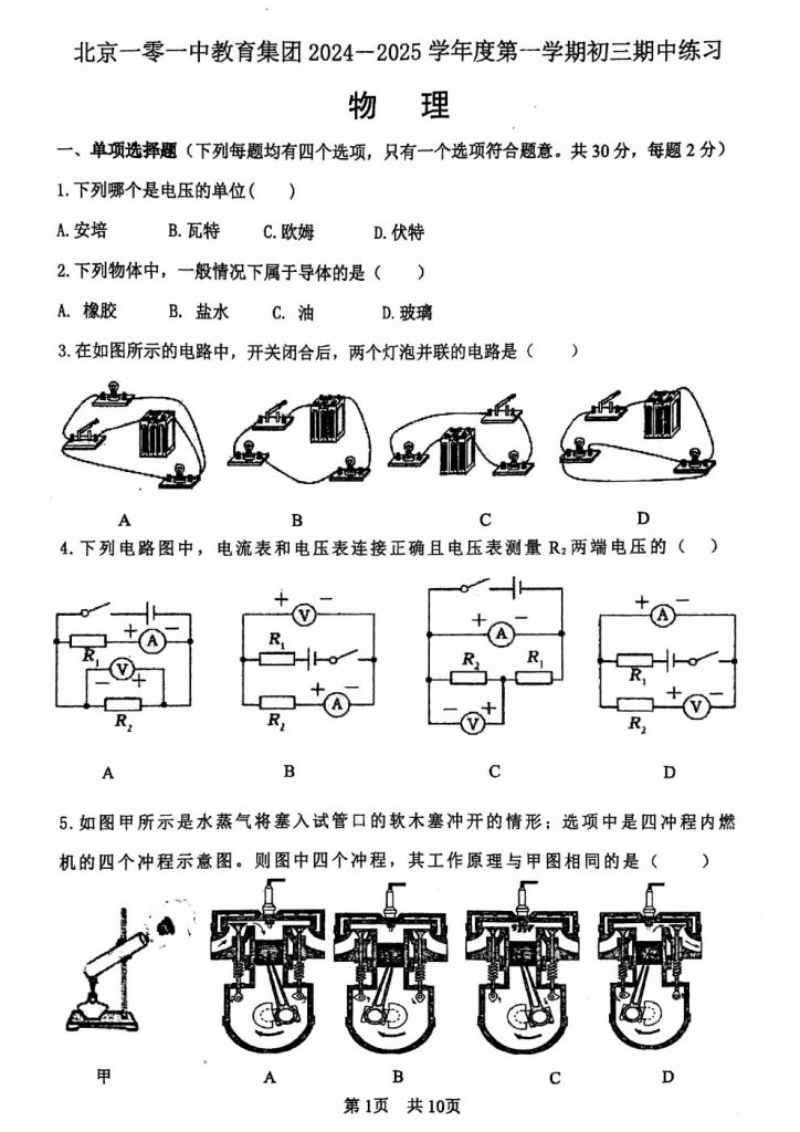 北京2024-2025学年期中考试正在陆续进行中,为方便大家对答案、下载练习等小编给大家搜集了2024北京一零一中初三(上)期中物理试卷,需要的小伙伴赶紧下载练习起来吧:
