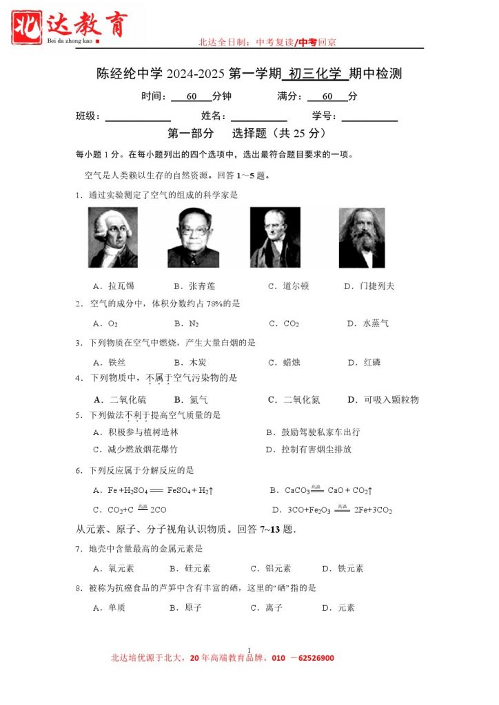 北京2024-2025学年期中考试正在陆续进行中,为方便大家对答案、下载练习等小编给大家搜集了2024北京陈经纶中学初三(上)期中化学试题及答案,需要的小伙伴赶紧下载练习起来吧: …