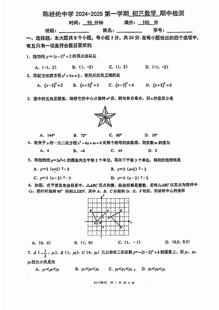 北京2024-2025学年期中考试正在陆续进行中,为方便大家对答案、下载练习等小编给大家搜集了2024北京陈经纶中学初三(上)期中数学试题,需要的小伙伴赶紧下载练习起来吧: