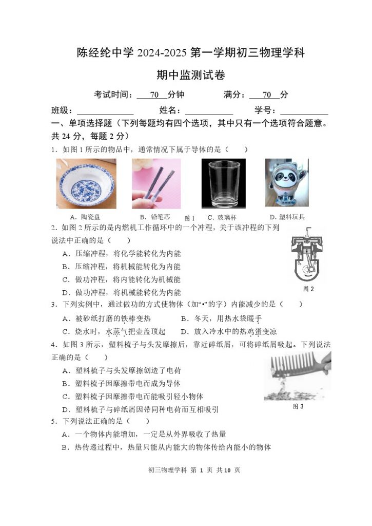 北京2024-2025学年期中考试正在陆续进行中,为方便大家对答案、下载练习等小编给大家搜集了2024北京陈经纶中学初三(上)期中物理试题,需要的小伙伴赶紧下载练习起来吧: