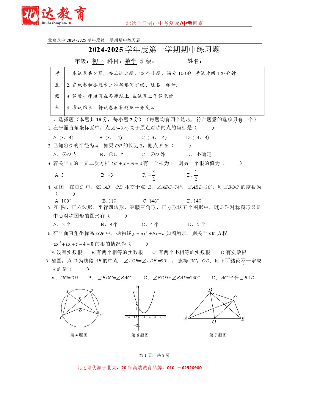 北京2024-2025学年期中考试正在陆续进行中,为方便大家对答案、下载练习等小编给大家搜集了2024北京八中初三(上)期中数学试题及答案,需要的小伙伴赶紧下载练习起来吧: