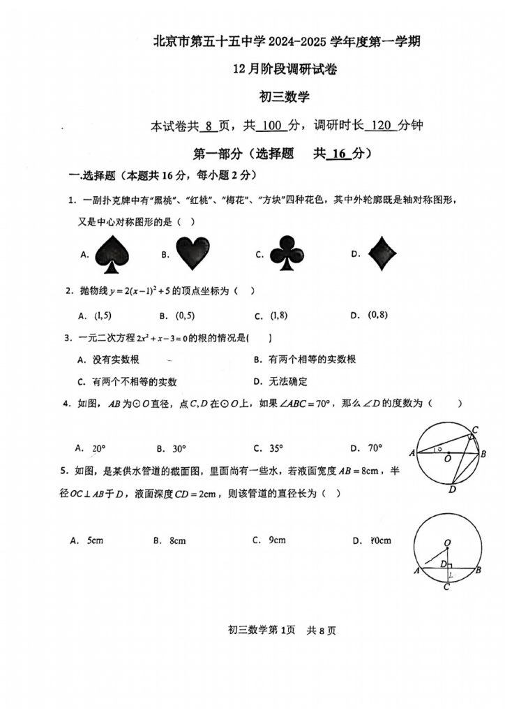 北京2024-2025学年初三12月月考正在陆续进行中,为方便大家对答案、下载练习等小编给大家搜集了2024北京五十五中初三12月月考数学试题及答案,需要的小伙伴赶紧下载练习起来吧: