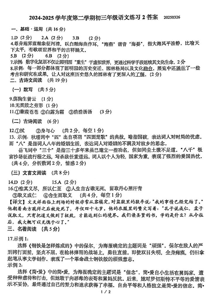admw360教研组收集整理了2025人大附中初三3月月考语文试卷及答案,分享给大家,快来下载复习吧。