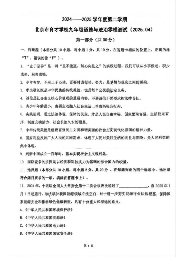 admw360教研组收集整理了2025北京育才学校初三零模道法试题及答案,分享给大家,快来下载复习吧。