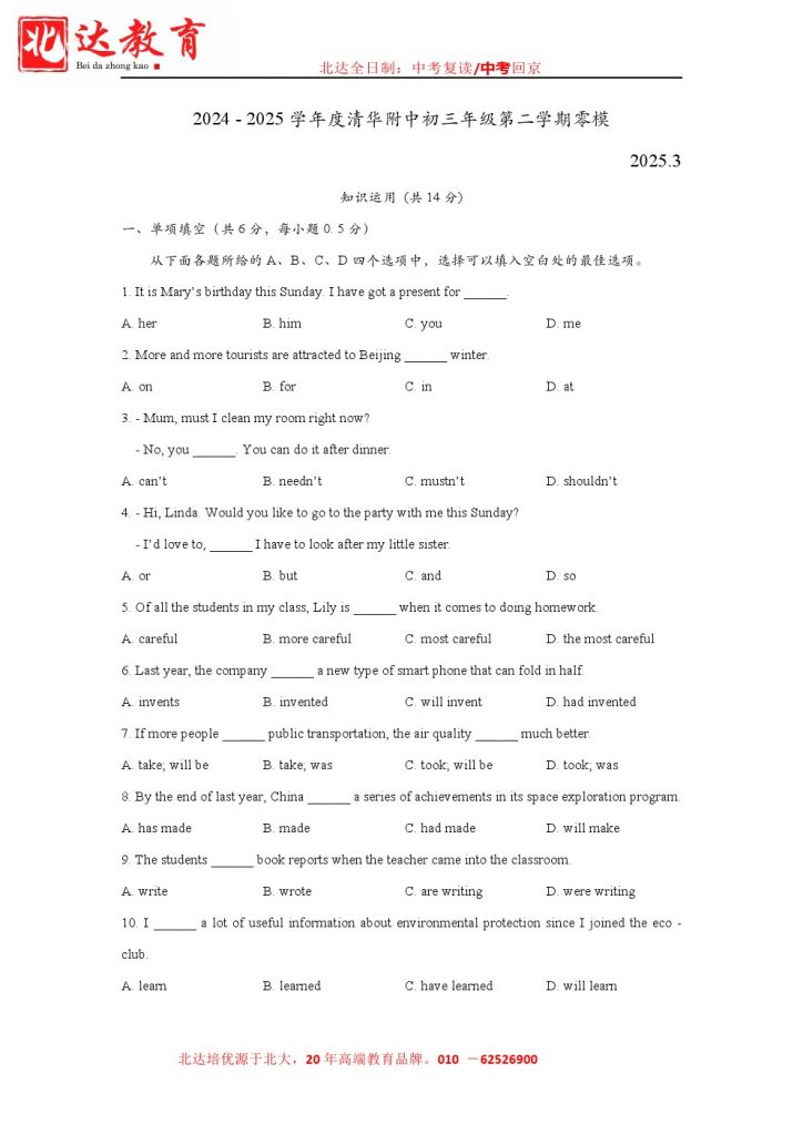 admw360教研组收集整理了北京清华附中2025初三零模英语试题及答案,分享给大家,快来下载复习吧。