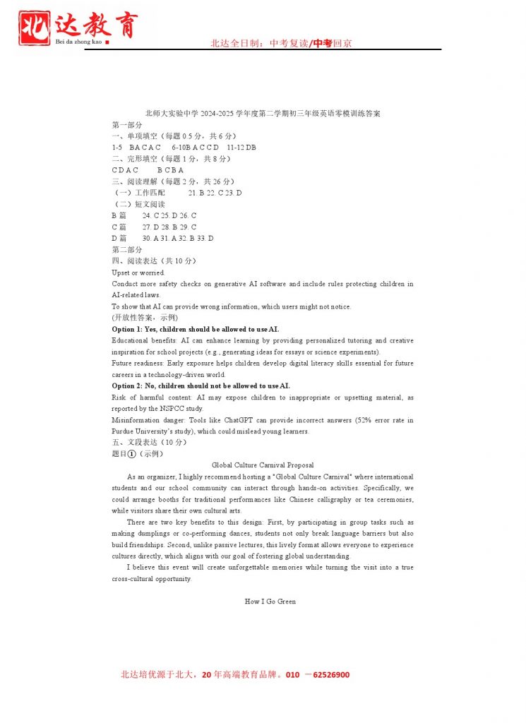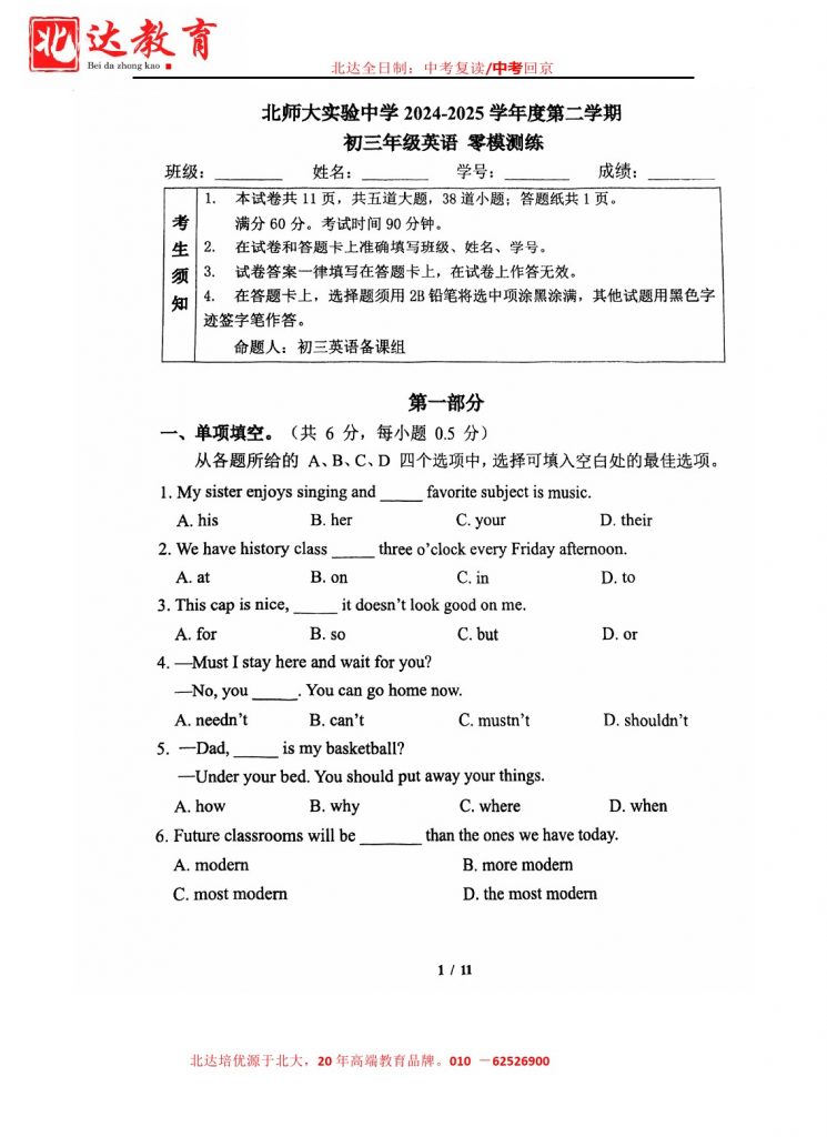 admw360教研组收集整理了北师大实验中学2025初三零模英语试题及答案,分享给大家,快来下载复习吧。