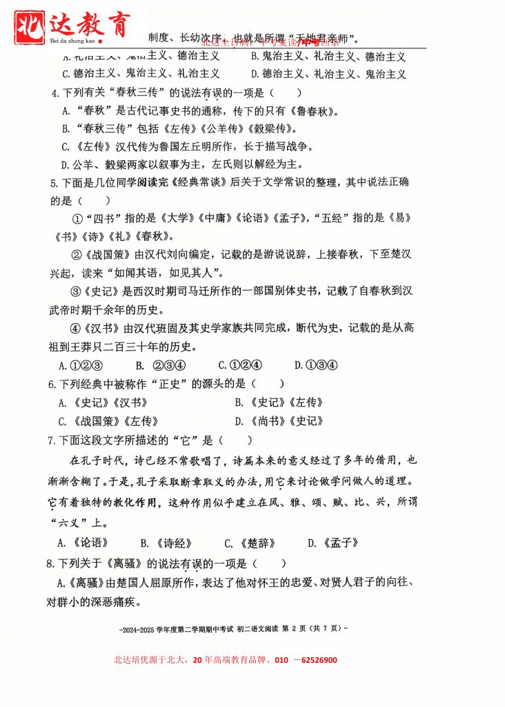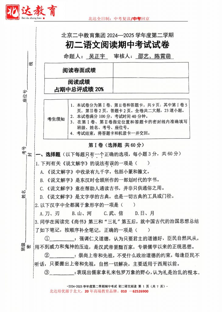 2025北京各区初二期中考已陆续开始,admw360教研组整理了2025北京二中初二(下)期中语文(阅读)试题,分享给大家。