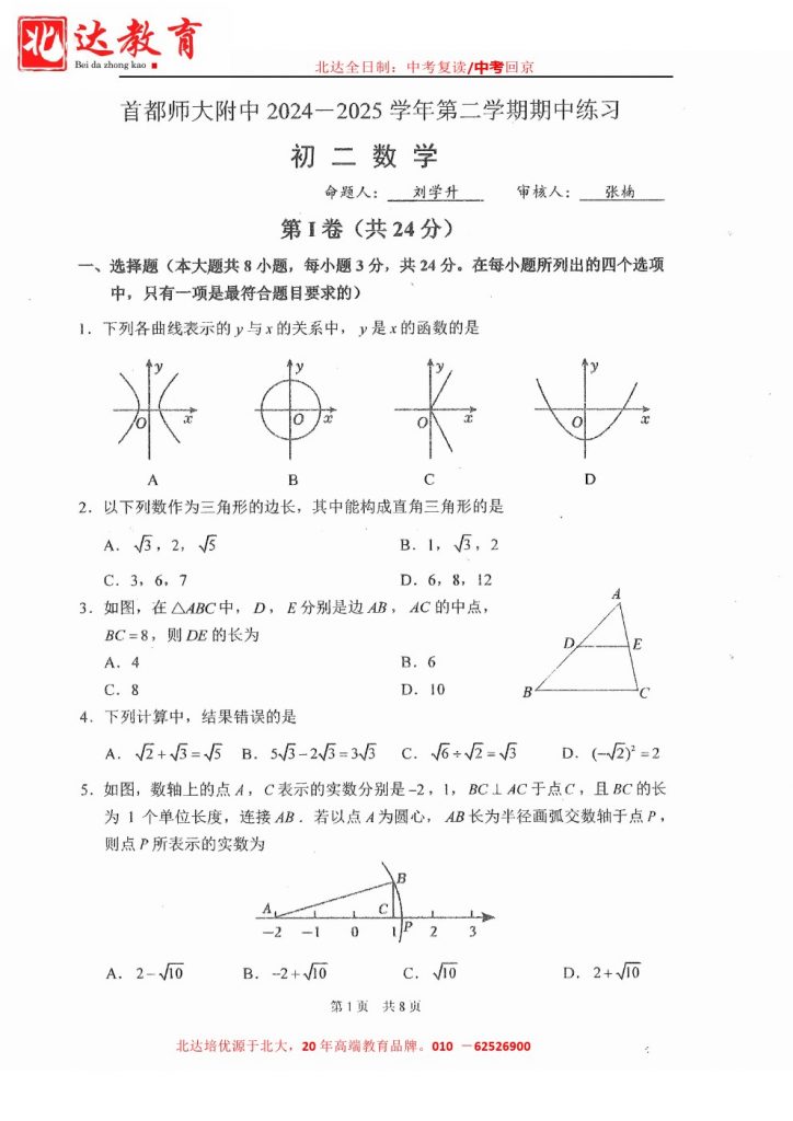 2025北京各区初二期中考已陆续开始,admw360教研组整理了2025北京首都师大附中初二(下)期中数学试题,分享给大家。