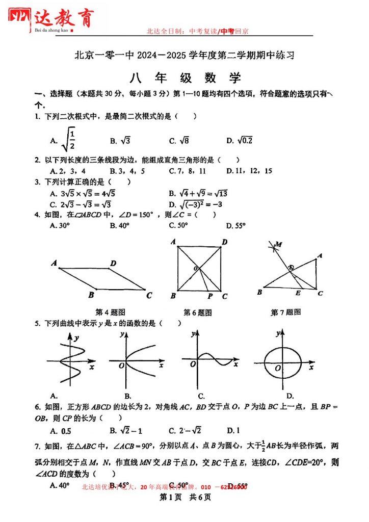2025北京各区初二期中考已陆续开始,admw360教研组整理了2025北京一零一中初二(下)期中数学试题,分享给大家。