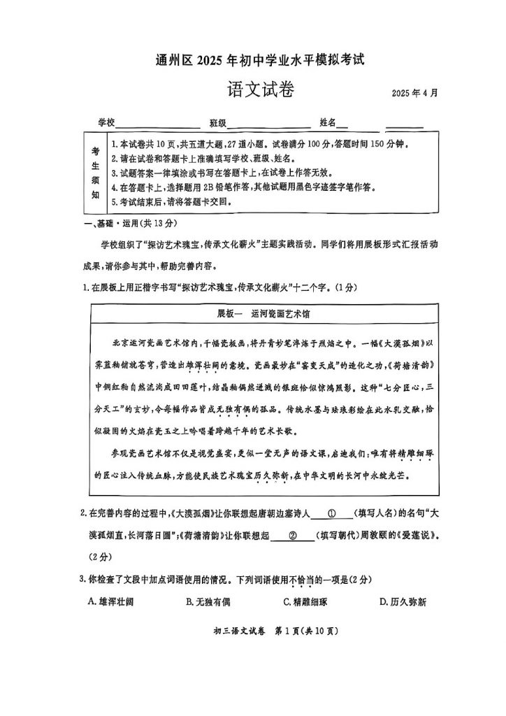 2025北京各区初三一模已陆续开始,admw360教研组整理了2025北京通州区初三一模语文试题及答案,分享给大家。快来下载复习吧。