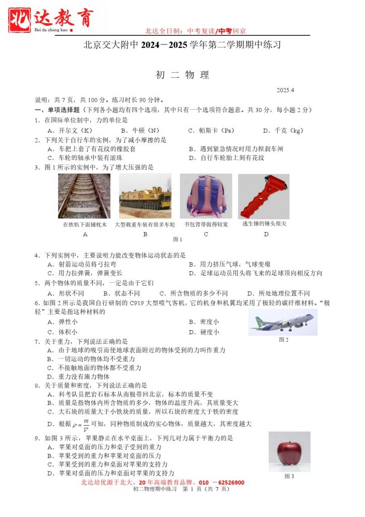 2025北京各区初二期中考已陆续开始,admw360教研组整理了2025北京交大附中初二(下)期中物理试题,分享给大家。