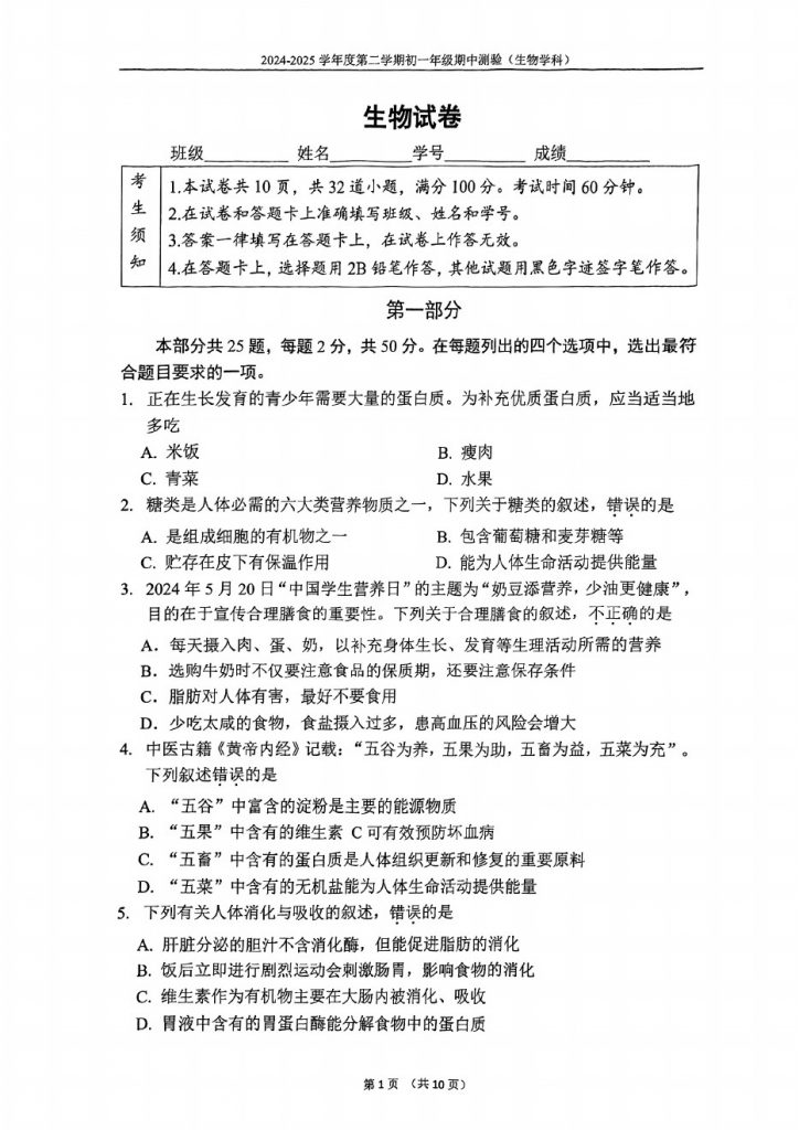 2025北京各区初一期中考已陆续开始,admw360教研组整理了2025北京四中初一(下)期中生物试题,分享给大家。
