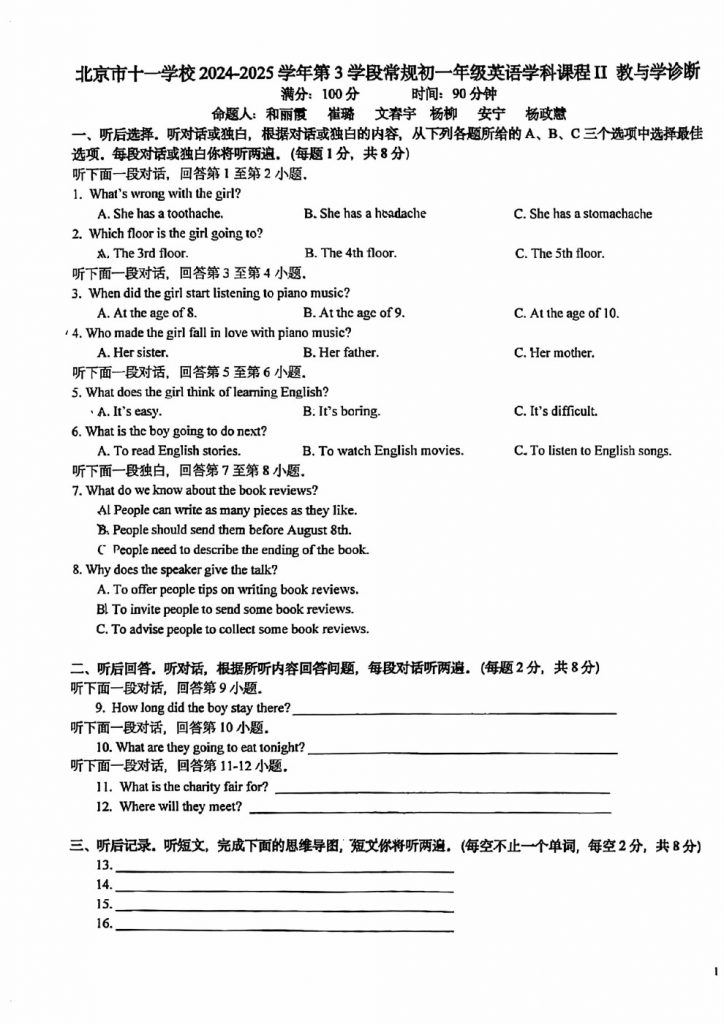 2025北京各区初一期中考已陆续开始,admw360教研组整理了北京十一学校2025初一(下)期中英语试题,分享给大家。