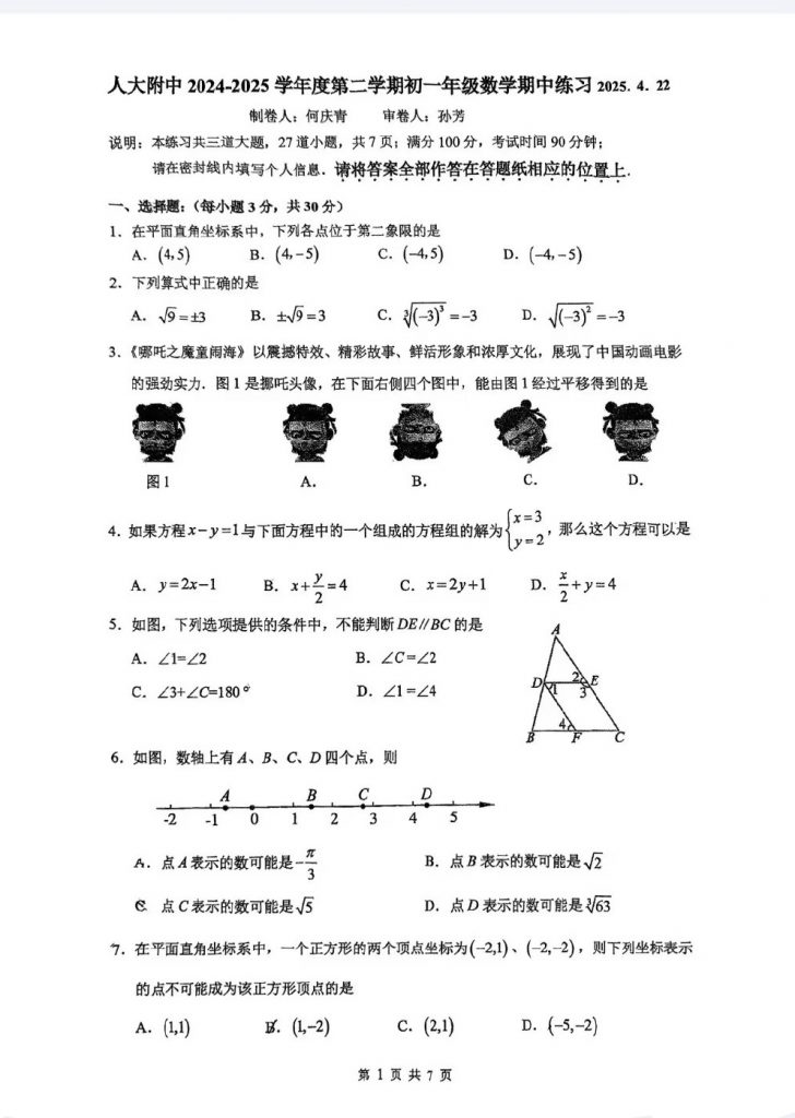 2025北京各区初一期中考已陆续开始,admw360教研组整理了2025北京人大附初一(下)期中数学试题,分享给大家。