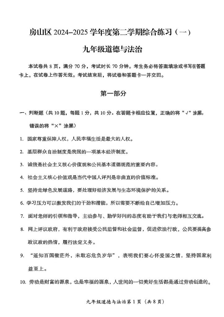 2025北京各区初三一模已陆续开始,admw360教研组整理了2025北京房山区初三一模道法试题及答案,分享给大家。快来下载复习吧。