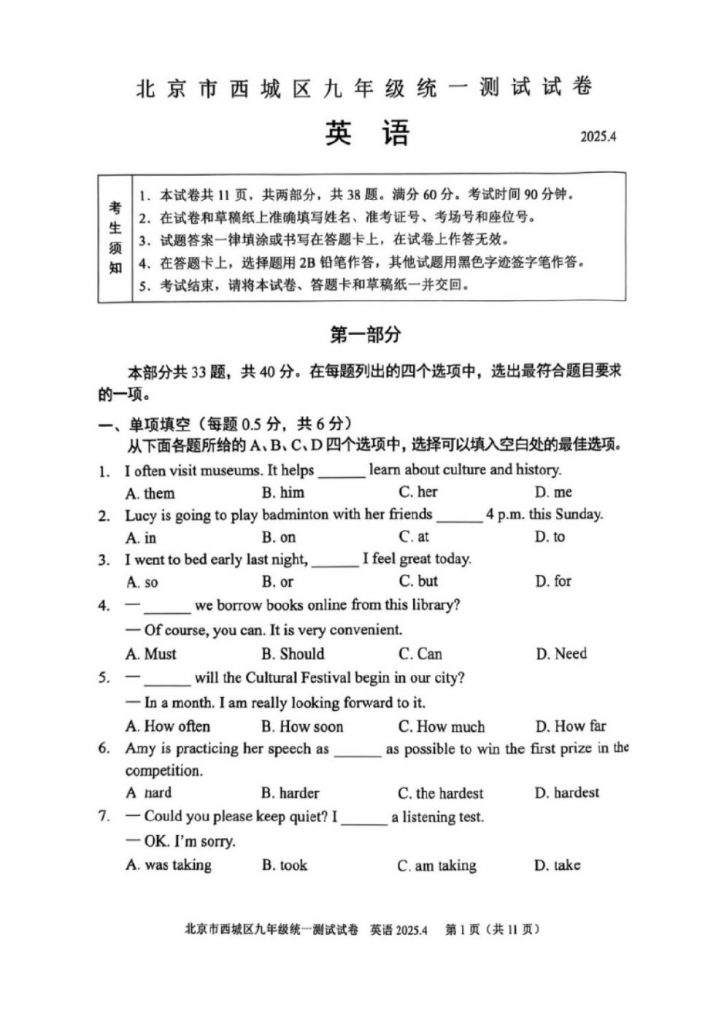 2025北京各区初三一模已陆续开始,admw360教研组整理了2025北京西城区初三一模英语试题及答案,分享给大家。快来下载复习吧。