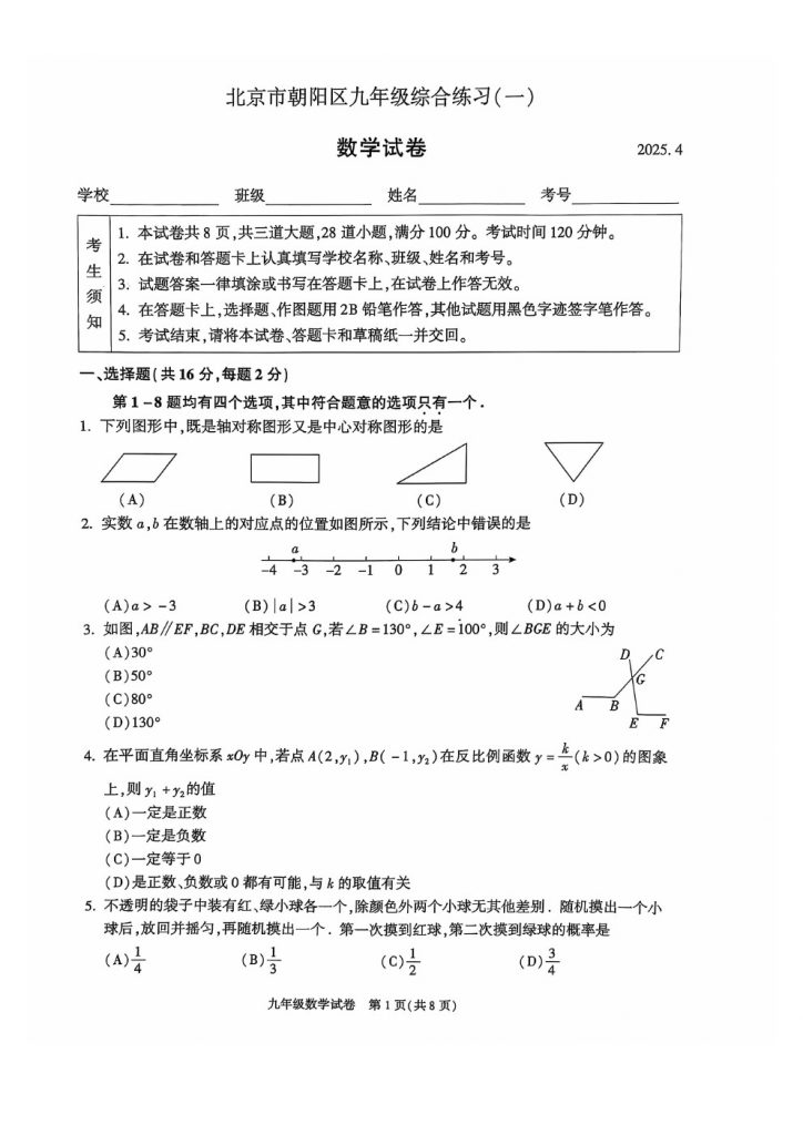 2025北京各区初三一模已陆续开始,admw360教研组整理了北京朝阳区2025初三一模数学试题及答案,分享给大家。快来下载复习吧。