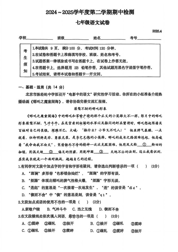2025北京各区初一期中考已陆续开始,admw360教研组整理了2025年北京陈经纶中学初一(下)期中语文试题,分享给大家。
