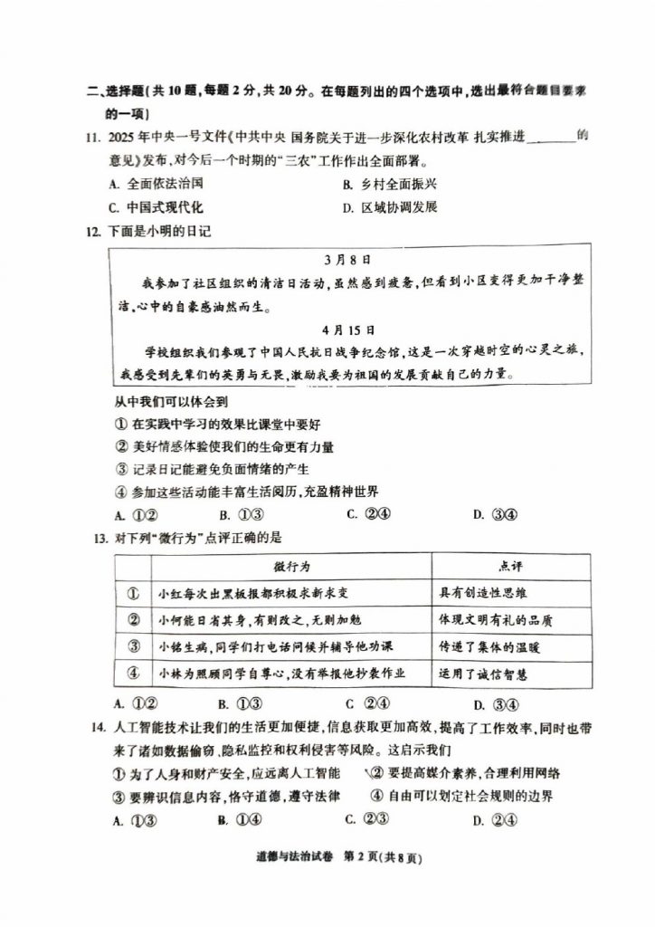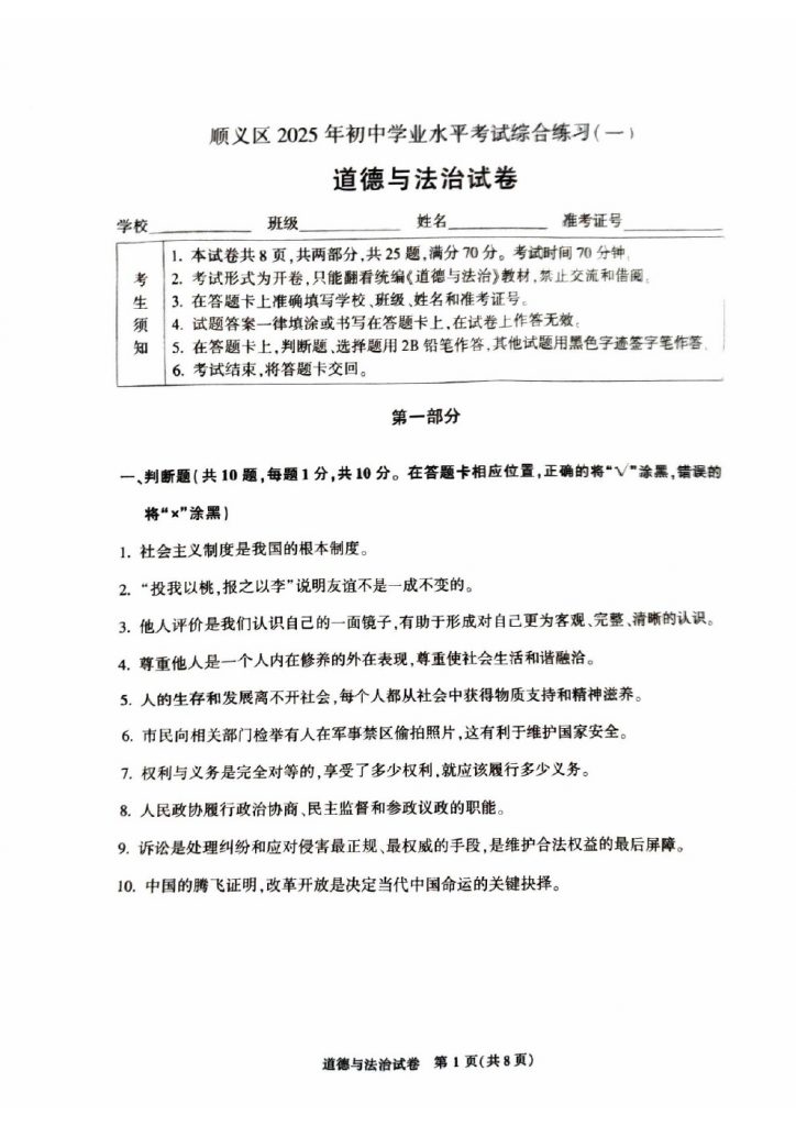 2025北京各区初三一模已陆续开始,admw360教研组整理了2025北京顺义区初三一模道法试题及答案,分享给大家。快来下载复习吧。