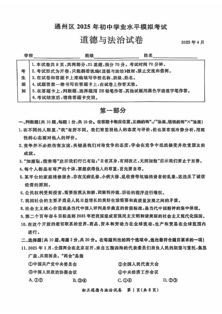 2025北京各区初三一模已陆续开始,admw360教研组整理了2025北京通州区初三一模道法试题及答案,分享给大家。快来下载复习吧。