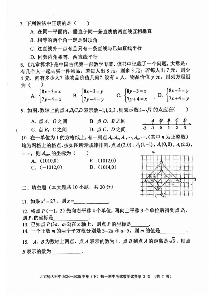 2025北京各区初一期中考已陆续开始,admw360教研组整理了2025北京北师大附中初一(下)期中数学试题,分享给大家。