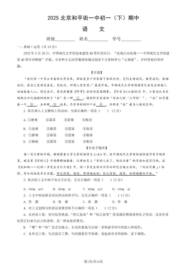 2025北京各区初一期中考已陆续开始,admw360教研组整理了2025北京和平街一中初一(下)期中语文试题及答案,分享给大家。
