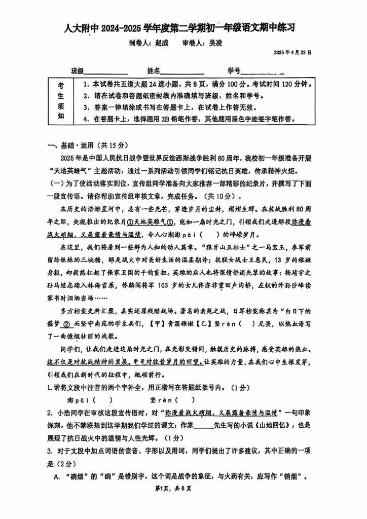 2025北京各区初一期中考已陆续开始,admw360教研组整理了2025北京人大附中初一(下)期中语文试题,分享给大家。