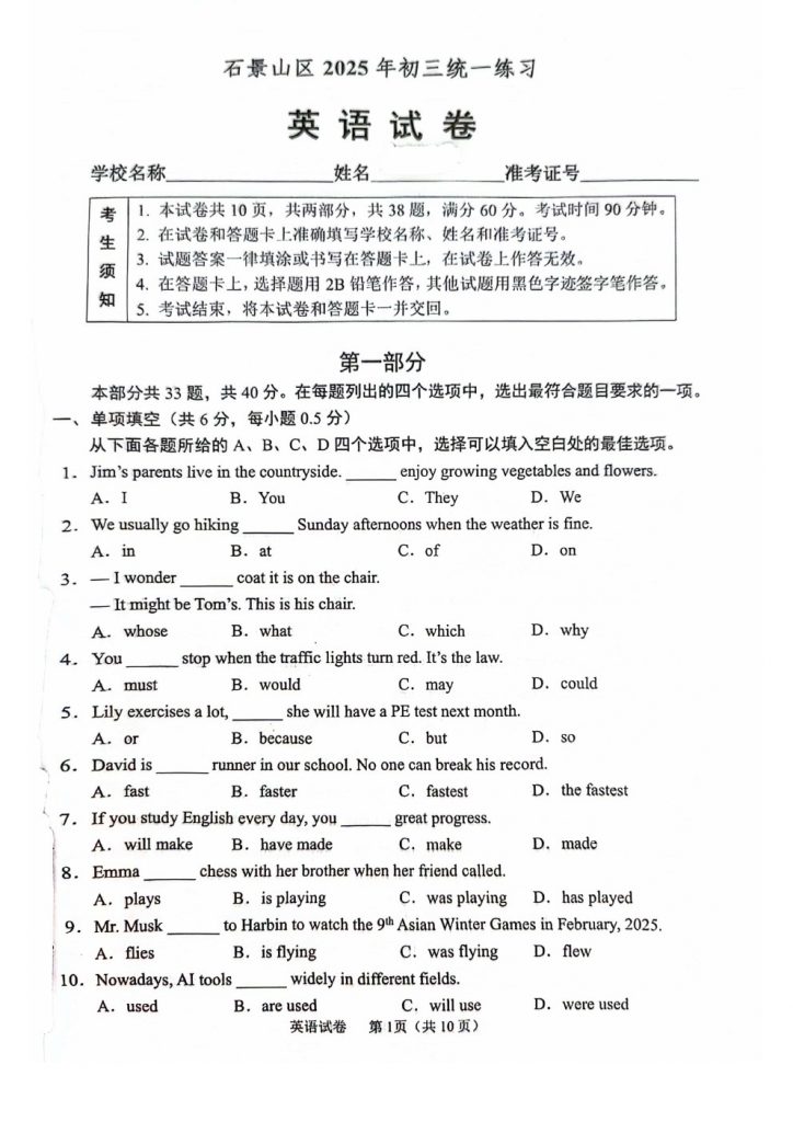 2025北京各区初三一模已陆续开始,admw360教研组整理了2025北京石景山区初三一模英语试题及答案,分享给大家。快来下载复习吧。