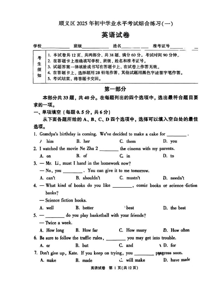 2025北京各区初三一模已陆续开始,admw360教研组整理了2025北京顺义区初三一模英语试题及答案,分享给大家。快来下载复习吧。