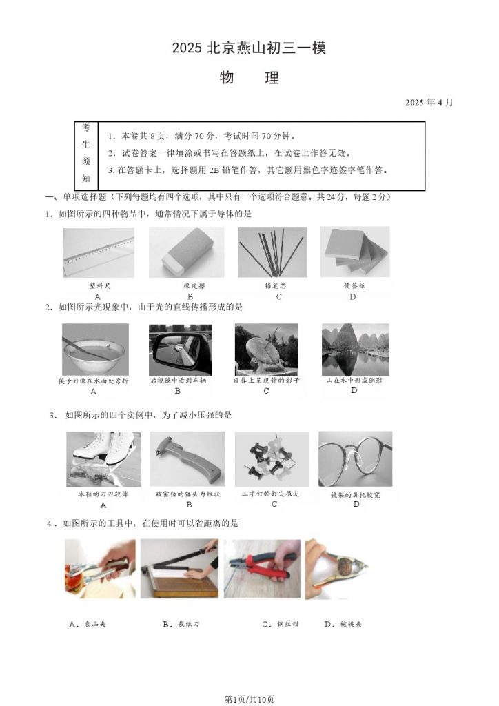 2025北京各区初三一模已陆续开始,admw360教研组整理了2025北京燕山区初三一模物理试题及答案,分享给大家。快来下载复习吧。