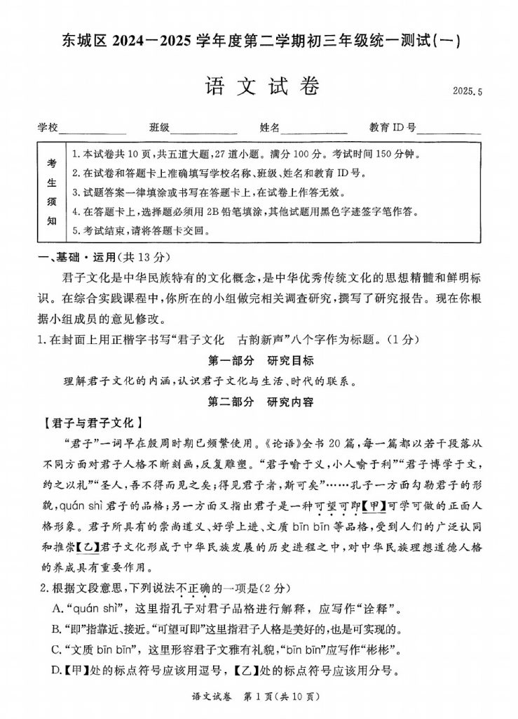 2025北京各区初三一模已陆续开始,admw360教研组整理了2025北京东城区初三一模语文试题及答案,分享给大家。快来下载复习吧。