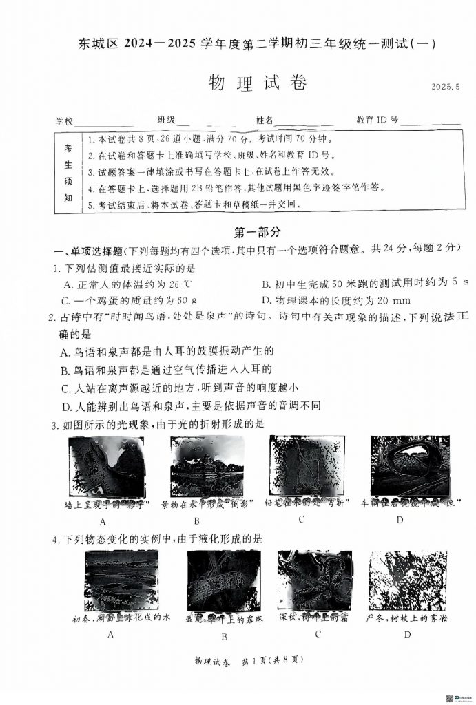 2025北京各区初三一模已陆续开始,admw360教研组整理了2025北京东城区初三一模物理试题及答案,分享给大家。快来下载复习吧。