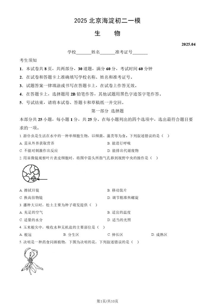 2025北京各区初二一模已陆续开始,admw360教研组整理了2025北京海淀区初二一模生物试题及答案,分享给大家。快来下载复习吧。