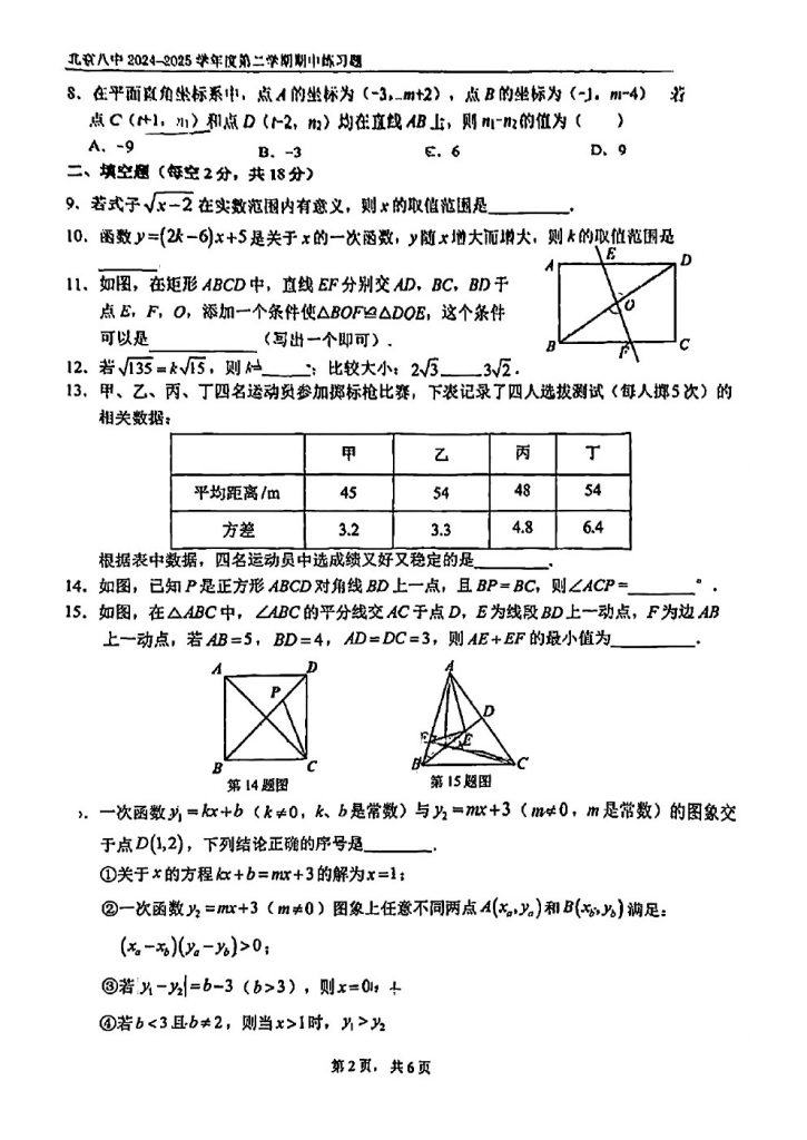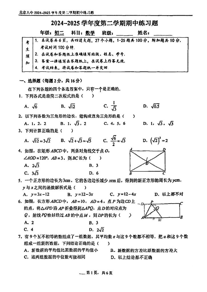 2025北京各区初二期中考已陆续开始,admw360教研组整理了2025北京八中初二(下)期中数学试题,分享给大家。