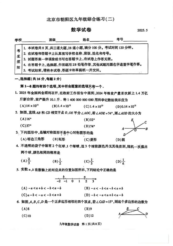 2025北京各区初三二模已陆续开始,admw360教研组整理了22025朝阳区初三二模数学试题及答案,分享给大家。