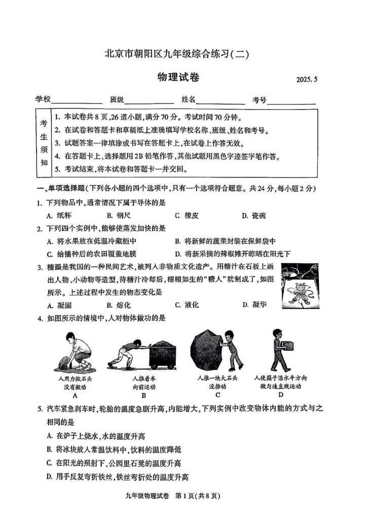 2025北京各区初三二模已陆续开始,admw360教研组整理了2025北京朝阳区初三二模物理试题及答案,分享给大家。