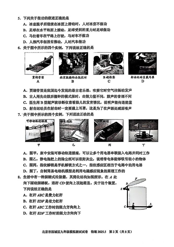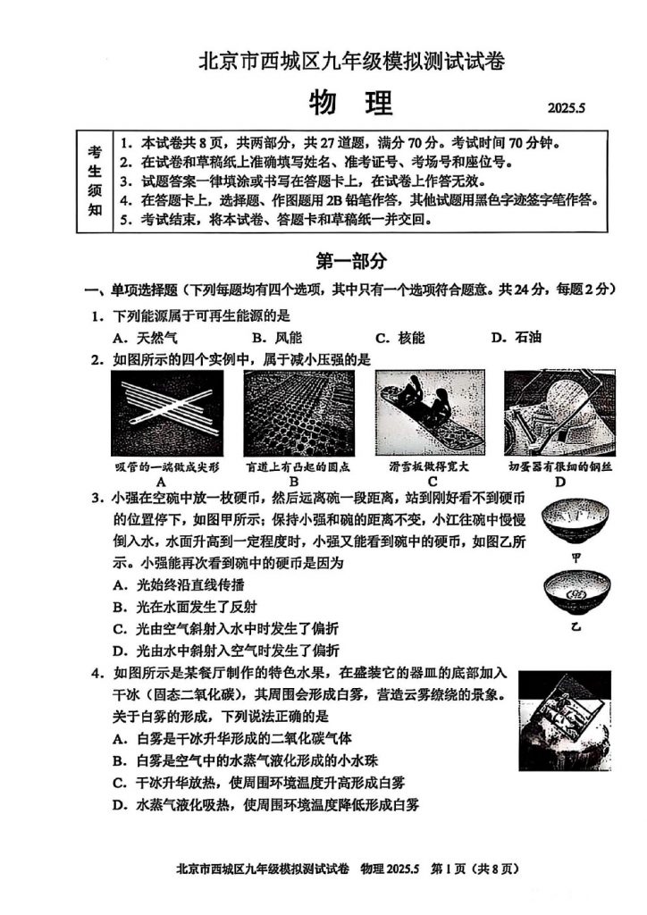 2025北京各区初三二模已陆续开始,admw360教研组整理了2025北京西城区初三二模物理试卷及答案,分享给大家。