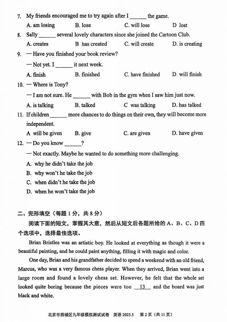 2025北京各区初三二模已陆续开始,admw360教研组整理了北京西城区2025初三二模英语试题及答案,分享给大家。