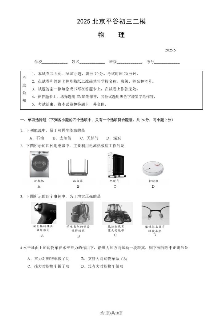 2025北京各区初三二模已陆续开始,admw360教研组整理了2025北京平谷区初三二模物理试题及答案,分享给大家。