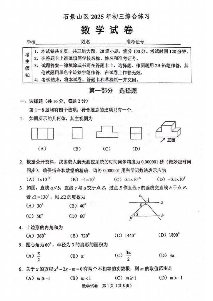 2025北京各区初三二模已陆续开始,admw360教研组整理了2025北京石景山区初三二模数学试题,分享给大家。