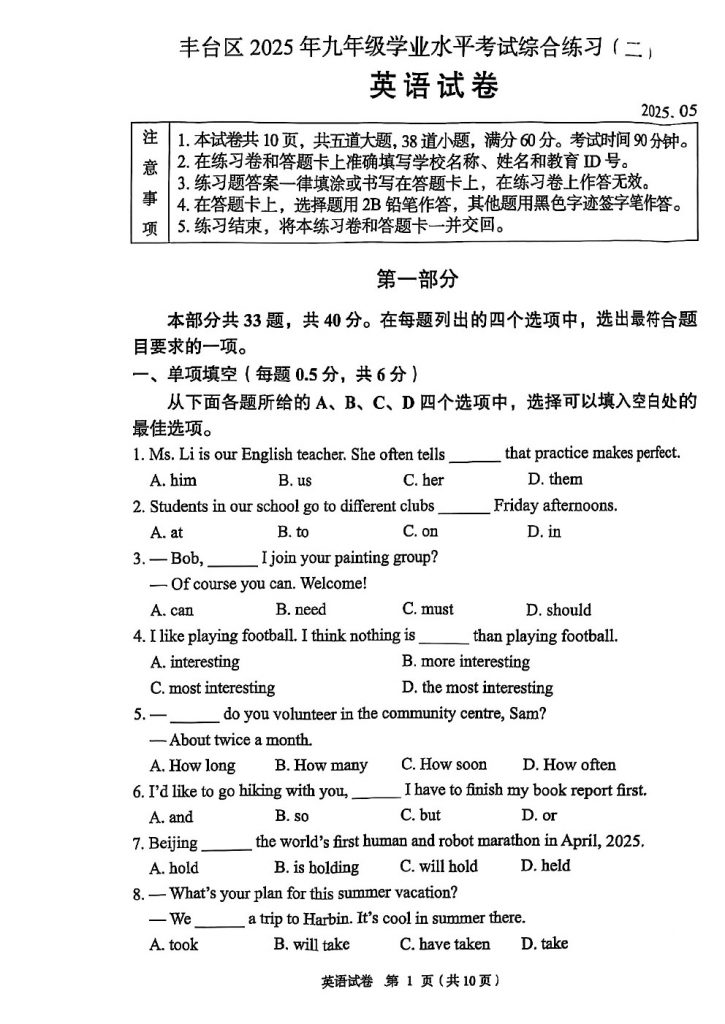 2025北京各区初三二模已陆续开始,admw360教研组整理了北京丰台区2025初三二模英语试题及答案,分享给大家。