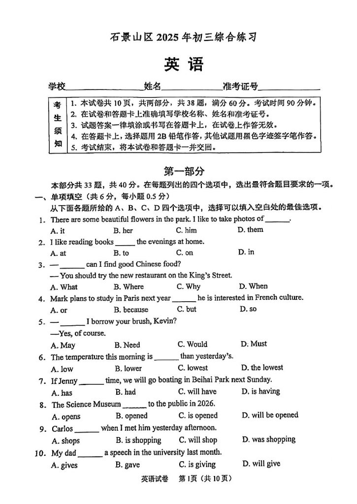 2025北京各区初三二模已陆续开始,admw360教研组整理了北京石景山2025初三二模英语试题及答案,分享给大家。