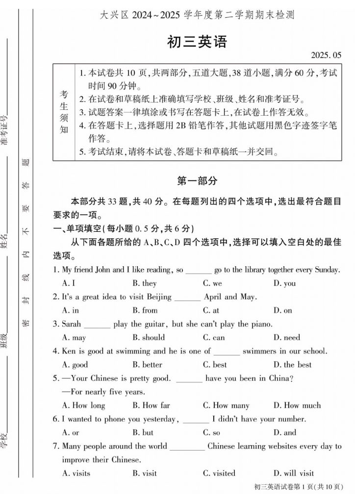2025北京各区初三二模已陆续开始,admw360教研组整理了2025大兴初三二模英语试题及答案,分享给大家。