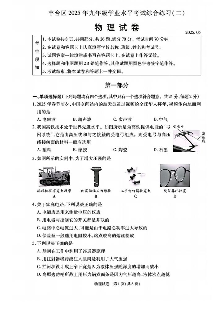 2025北京各区初三二模已陆续开始,admw360教研组整理了2025北京丰台区初三二模物理试题及答案,分享给大家。