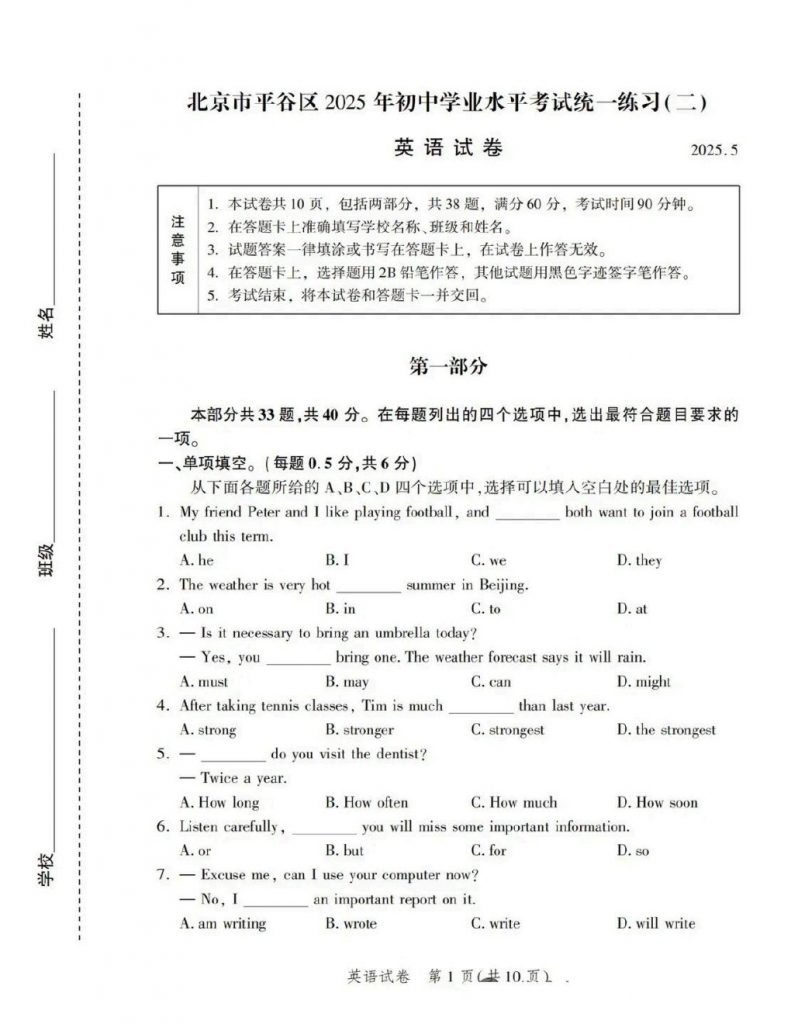 2025北京各区初三二模已陆续开始,admw360教研组整理了北京平谷2025初三二模英语试题及答案,分享给大家。
